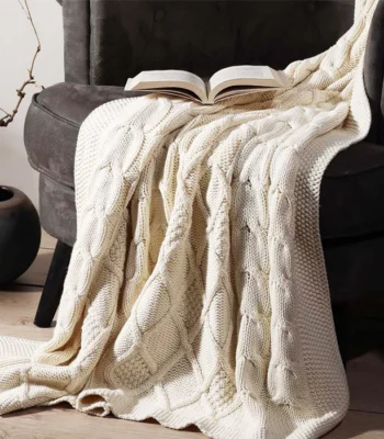 The design features knits of three different styles to create a delightful visual depth. On the sides you have thick cable-knits framing the center that has a thinner cable knit in a honeycomb pattern. Some of the honeycombs have been filled in with moss knits for an additional detail to elevate the look. This throw also has a larger size so that you can use it at your sofa or bed as per your preference!